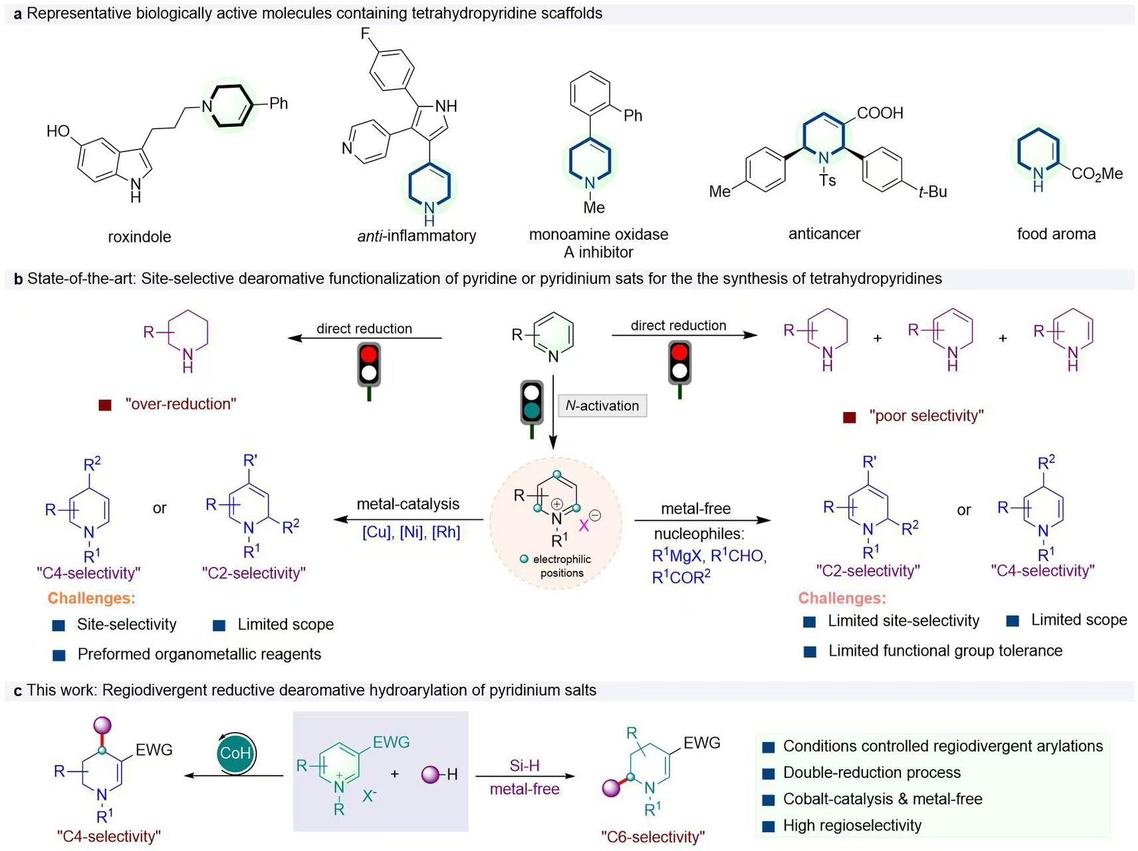 四氢吡啶骨架是一类非常重要且广泛存在的结构单元,常见于天然产物、生物活性分子及药物分子结构中。因此,开发高效、通用的合成方法,用于制备具有不同取代基的四氢吡啶骨架,受到了学术界的广泛关注。但是,区域选择性和位点多样性的控制仍是该研究领域尚未解决的重要挑战。该研究论文首次构建了一种钴催化与无金属条件调控的吡啶盐区域选择性和位点多样性还原氢芳基化反应。该反应能在温和条件下,从相同原料出发,直接合成出在不同位置带有芳基取代基的四氢吡啶骨架化合物,在药物化学等领域具有很好的合成应用价值。机理研究表明,该反应经历了由钴氢化物(CoH)介导的吡啶鎓盐双还原过程。