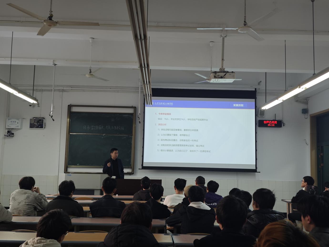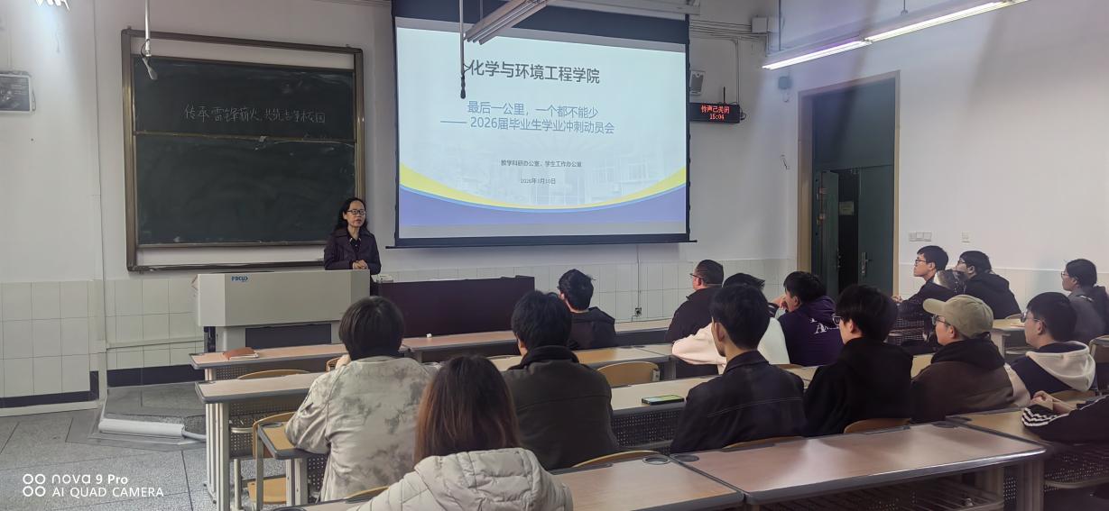 为全面落实立德树人根本任务,精准把握2026届毕业生学业状况,切实做好毕业生学业指导与服务,3月10日下午,由化学与环境工程学院教科办与学工办联合举办,在厚德楼121教室召开2026届本科毕业生学业冲刺动员会。学院副院长符宇航、教科办副主任李建、毕业班辅导员苏美文及部分2026届本科毕业生参加会议。会议由李建主持。