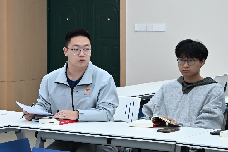 在随后的读书分享环节,所有参会同学结合自身实际,畅谈学习体会。其中,学生第二党支部正式党员、环境工程专业2022级1班尹玛强同学表示,作为党员,应该在基层一线经风雨、长才干,以实干担当践行“青春由磨砺而出彩,人生因奋斗而升华”的青春使命。