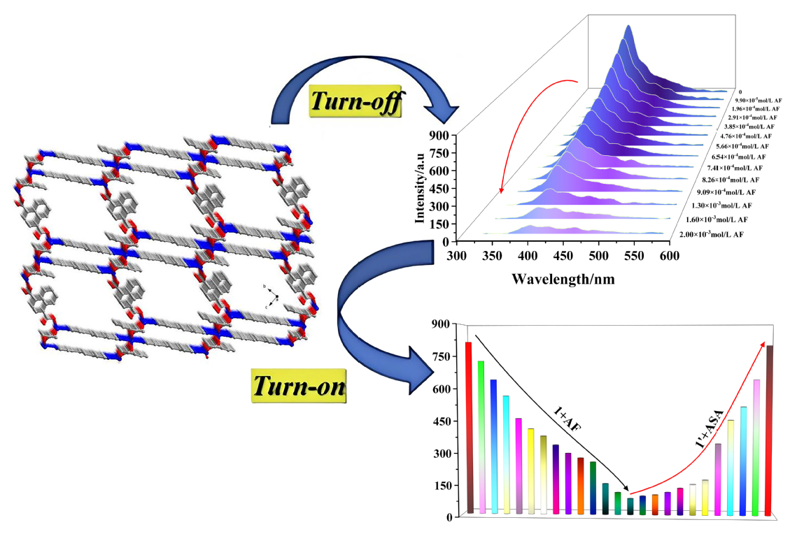 该论文通过水热反应合成了高稳定性的锌化合物Zn-MOF-1,经系统表征证实其具有独特的三维双重互穿菱形网络结构。基于优异的发光性能,该材料可实现对柠檬酸铁铵(AF)和阿司匹林(ASP)的高选择性荧光传感,分别呈现“关闭”与“开启”响应,荧光检测限分别为4.573×10-5mol/L和4.215×10-5mol/L,在实际水样中回收率超过95%。研究阐明了MOFs材料的荧光传感作用机制,为环境化学及生物分析领域的新型荧光传感研发提供了新思路。