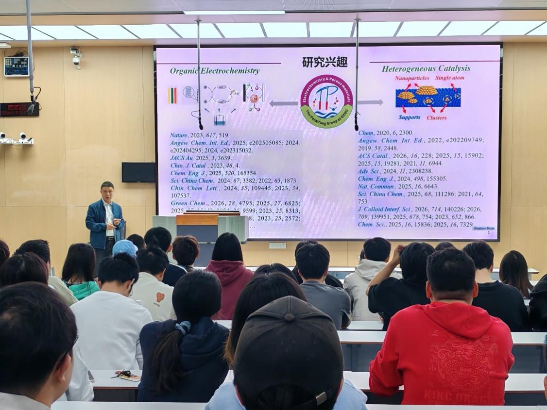 2026年4月13日上午9:00,广西师范大学潘英明教授应邀莅临我校,在汇东校区厚德楼N1-206进行了题为《多孔有机聚合物多尺度催化的有机合成反应》的学术报告。此次报告由化环学院张国成书记主持,化环、化工学院的教师和学生参加了此次报告会。