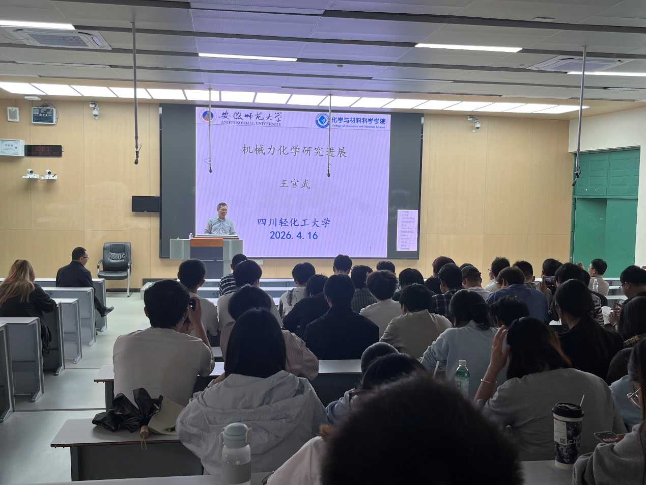为促进学术交流,拓展师生科研视野,4月16日下午,应四川轻化工大学化学与环境工程学院邀请,国家杰出青年基金获得者、安徽师范大学/中国科学技术大学王官武教授莅临我校,在汇东校区厚德楼N1-206作题为“机械力化学研究进展”的学术报告。此次报告由化学与环境工程学院党委书记张国成主持,学校化学类相关专业教师和研究生参加了此次报告会。